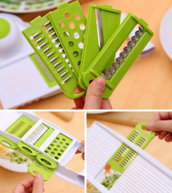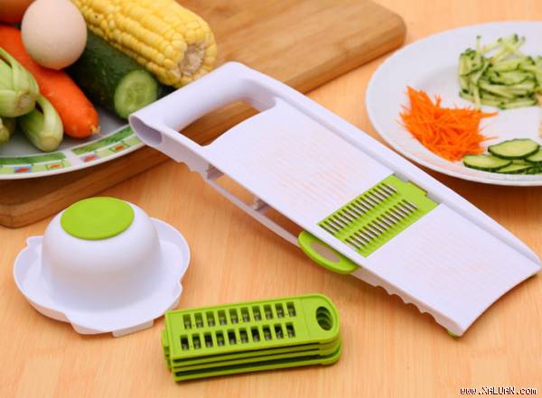 Nhỏ gọn, độc đáo, gồm 5 lưỡi dao với chức năng khác nhau như cắt khoanh, bào sợi, nghiền, tạo hình,… giúp sản phẩm này lấy lòng các bà nội trợ nhanh chóng. Những lưỡi dao sắc bén được chuyển đổi với nhau để phục vụ từng mục đích của bạn. Ngoài ra còn có một “chiếc mũ” để cố định các loại củ, tránh tổn thương tay nếu vô ý. Khi không sử dụng dễ dàng xếp gọn chúng bên dưới bề mặt và treo lên gọn gàng. Sản phẩm có kích thước 28 x 10.8cm, giá tham khảo: 150.000 đồng.
