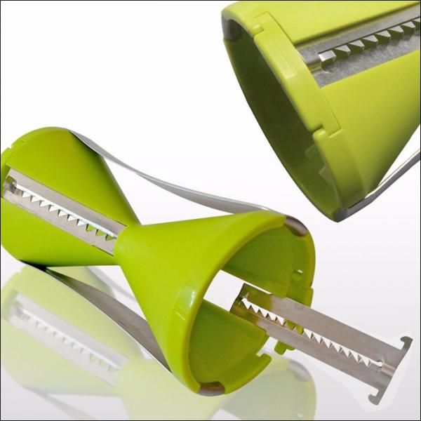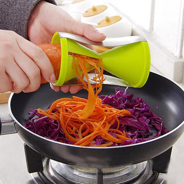 Dựa trên hình ảnh dụng cụ văn phòng phẩm quen thuộc - chiếc gọt bút chì - sản phẩm này giúp các bà nội trợ “hô biến” các loại củ quả thân cứng như cà rốt, dưa leo, củ cải,… thành hai dạng sợi dày mỏng khác nhau. Thao tác rất đơn giản, bạn chỉ cần đưa những thứ cần xử lý vào phần ống và xoay theo chiều kim đồng hồ, giống như khi gọt bút chì là đã có ngay thành phẩm. Đặc biệt rất hữu ích đối với những ai đang cần chế biến nhanh món nộm (gỏi) đúng không nào? Sản phẩm có kích thước 12.5 x 7.5 x 7.5cm, với nhiều màu xanh, đen, trắng, vàng,… Giá tham khảo: 80.000 đồng.