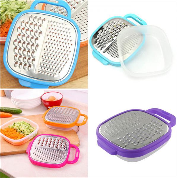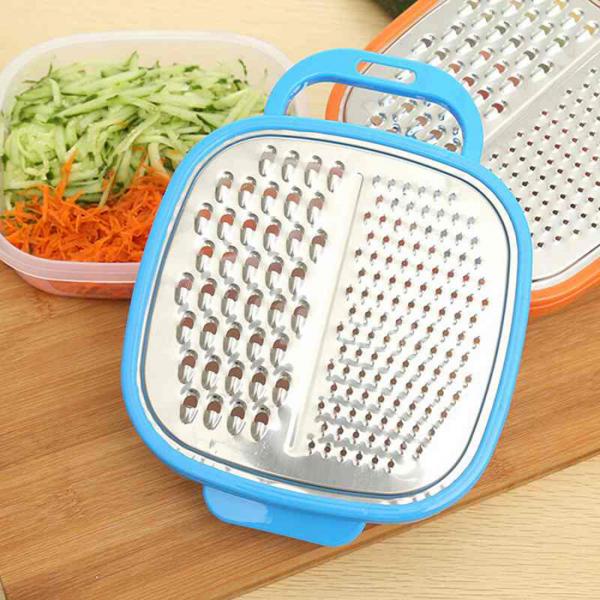 Chiếc hộp được thiết kế tiện lợi, bên dưới là ngăn đựng, bên trên là nắp đậy. Phần nắp này đồng thời cũng là dụng cụ để bào củ quả thành dạng sợi. Với hai kiểu bào dày, mỏng khác nhau, sợi được bào ra đều tăm tắp và đẹp mắt. Khi bạn thao tác, thành phẩm sẽ rơi xuống gọn gàng bên dưới hộp rồi mang đi chế biến. Sản phẩm được làm bằng nhựa và thép không gỉ, kích thước 23 x 17 x 5cm, gồm các màu: xanh lá cây, xanh dương, tím, hồng và cam. Giá tham khảo: 50.000 đồng.
