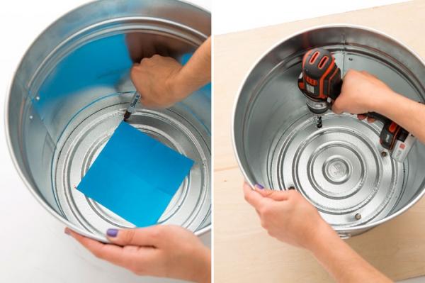 Đo đồng đều 4 lỗ trên đáy thùng để làm vị trí 4 chân ghế. Khoan các lỗ từ trong ra ngoài. Bạn có thể dùng một tờ giấy hình vuông để đảm bảo vị trí 4 lỗ được cân xứng, dùng bút đánh dấu lại. Khi khoan bạn nhớ đặt miếng gỗ dưới làm đế để tránh khoan vào các bề mặt khác.