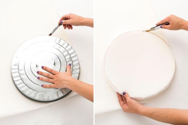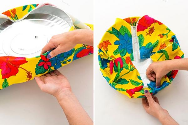 Dùng keo bắn nóng để bọc kín lớp vải bên ngoài nắp thùng và 2 lớp đệm xốp, đảm bảo miếng vải căng, phẳng.