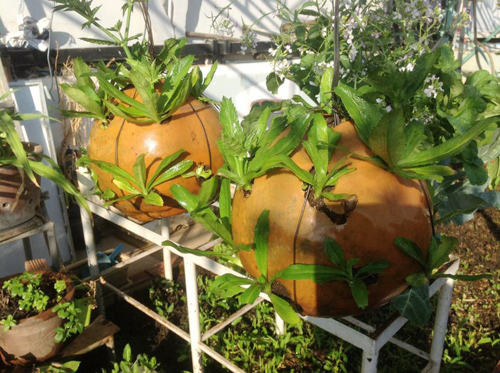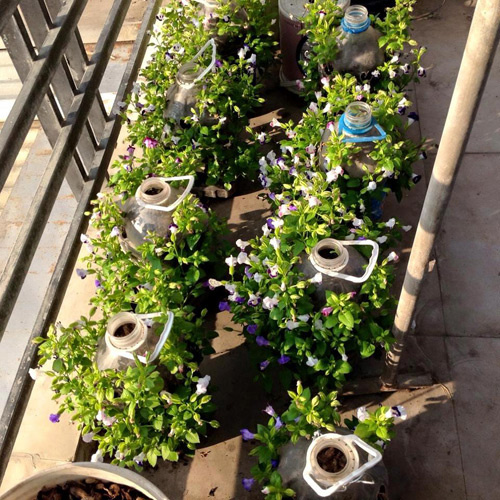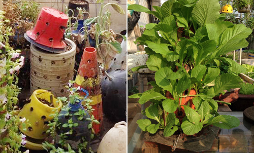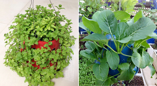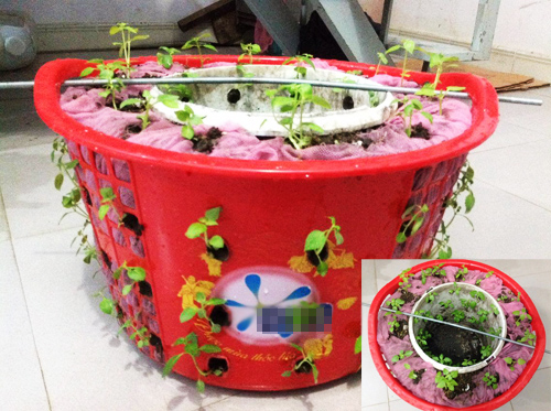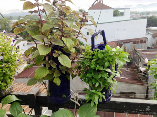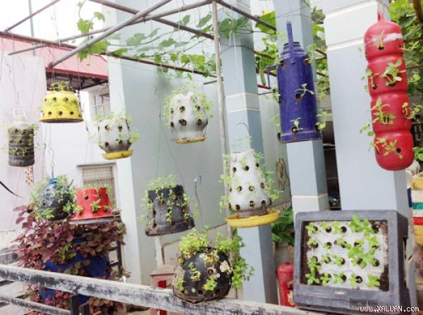 Những chiếc can, bình nước, hộp nhựa cũ, anh thường đục lỗ nhỏ, trộn phân và đất bỏ vào trong và treo lên cao để tiết kiệm diện tích. Những giỏ nhỏ như vậy thường được dùng để trồng hoa hay những rau gia vị nhỏ như kinh giới, húng, tía tô…