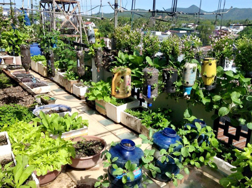 Nhờ ý tưởng dùng đồ bỏ đi để chứa đất trồng trọt, khu vườn 30 mét vuông của anh có chi phí không đáng kể mà vẫn trồng được đủ các loại cây trái, rau củ, cho thực phẩm tươi và sạch quanh năm.