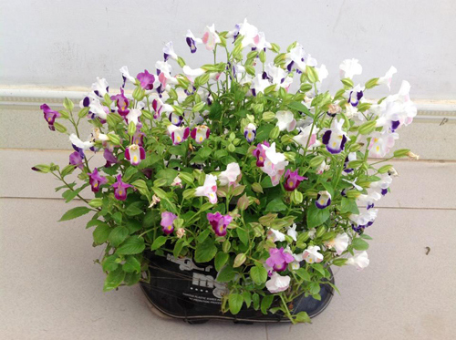 Giỏ đựng quần áo được "độ" thành chậu hoa với cây hoa mắt nai trồng kín xung quanh. Chủ vườn dự định sẽ lắm thêm bóng đèn năng lượng vào giữa để hoa nở đều cả mặt trong và ngoài chậu cho giống với mô hình "đấu trường La Mã thu nhỏ"