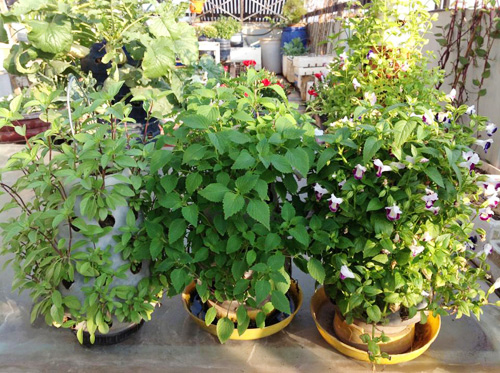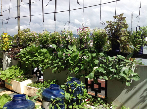 Khu vườn nhỏ trên sân thượng của anh có đủ các loại chậu chứa đất rất đa dạng