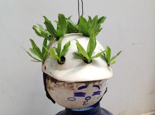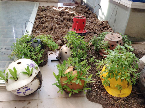 Rau thơm trồng trong mũ bảo hiểm, mũ bảo hộ và quả bóng nhựa cũ