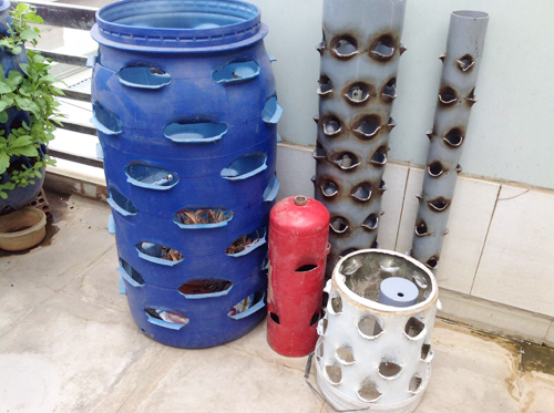 Các vật dụng bỏ đi đều được đục lỗ và trộn đất cùng phân bò mục bỏ vào trong để cung cấp dinh dưỡng cho cây