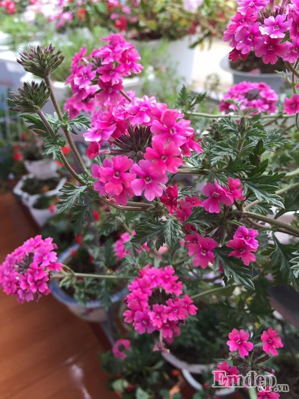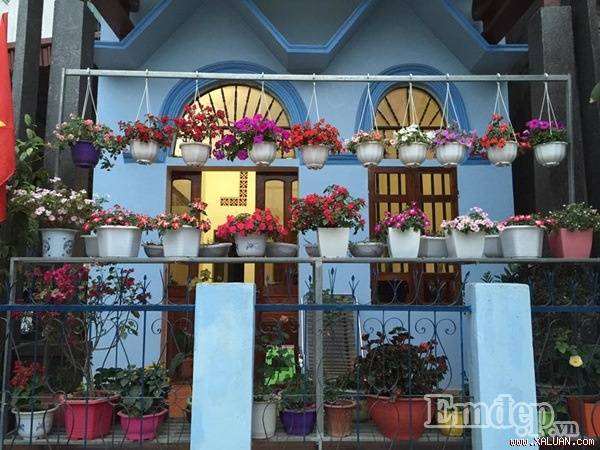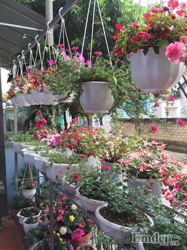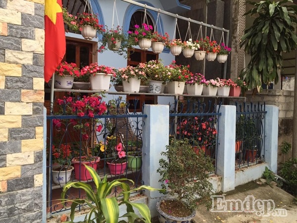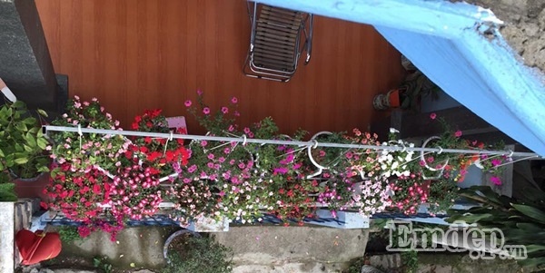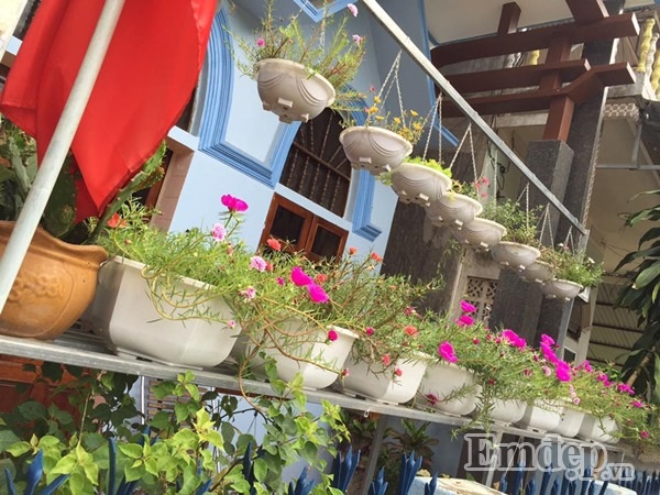 Phía trên cùng được chị treo những chậu hoa cần nhiều ánh sáng, tầng giữa được chị đặt những chậu hoa trên bệ tường rào, phía dưới cùng được chị Nhài được chị sắp xếp ngay ngắn các chậu hoa xinh xắn tạo nên ’vườn hoa’ đáng yêu, nhỏ nhắn cho chốn đi về của mình.