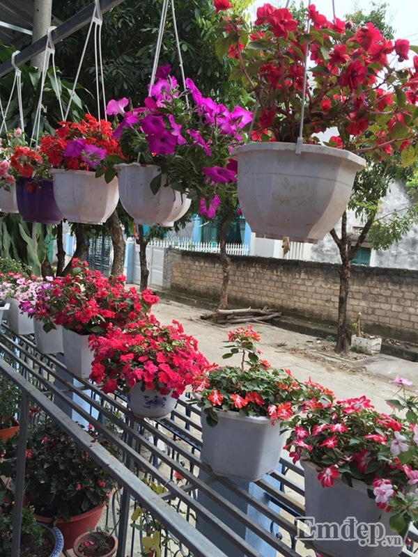 Những giỏ hoa được đặt quy củ, ngay ngắn trước nhà